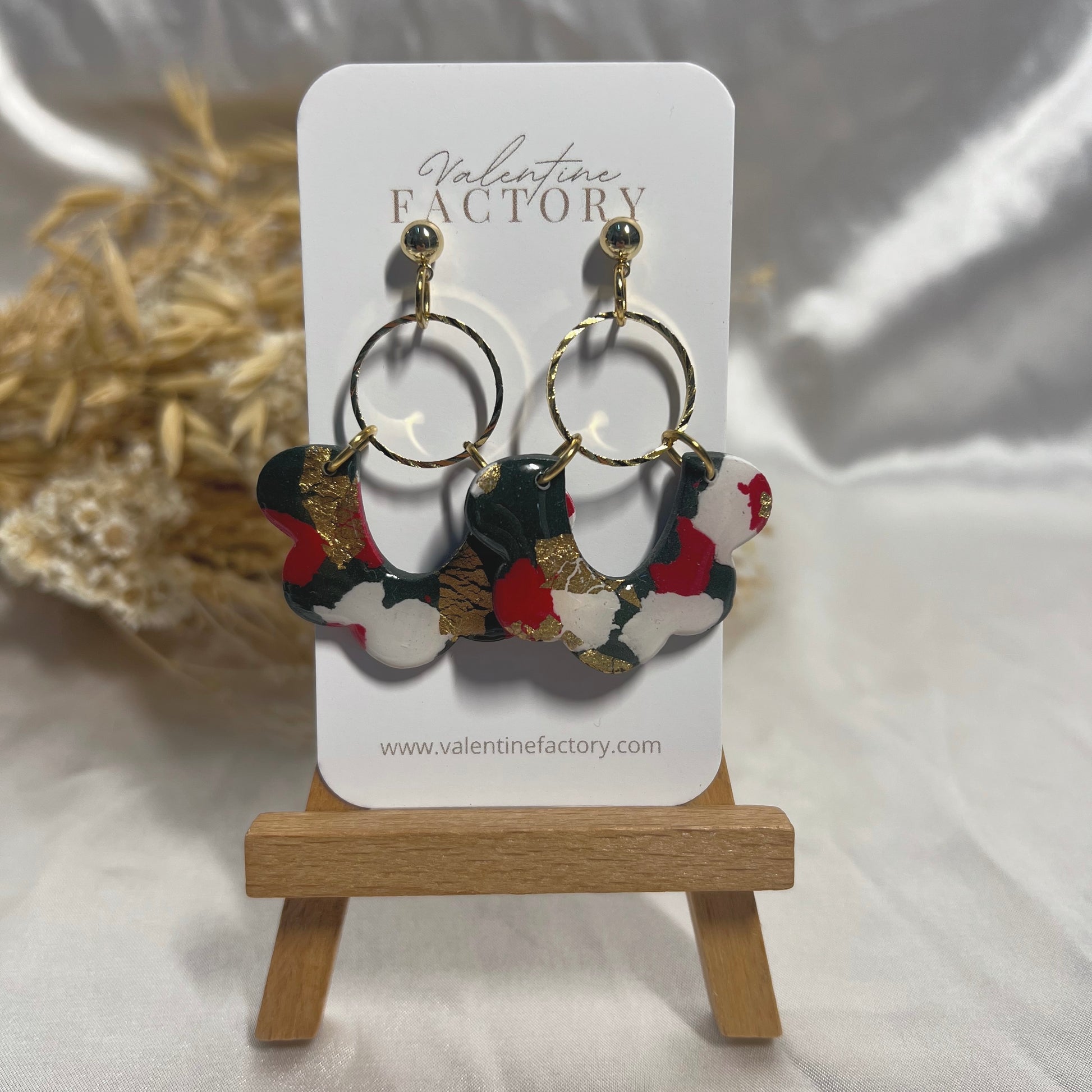 Les boucles d’oreilles sont faites à partir d’argile mélangé à la main, les motifs, les tâches d’or/argent ou autre impression sur chaque boucle d’oreille peuvent varier de l’image.